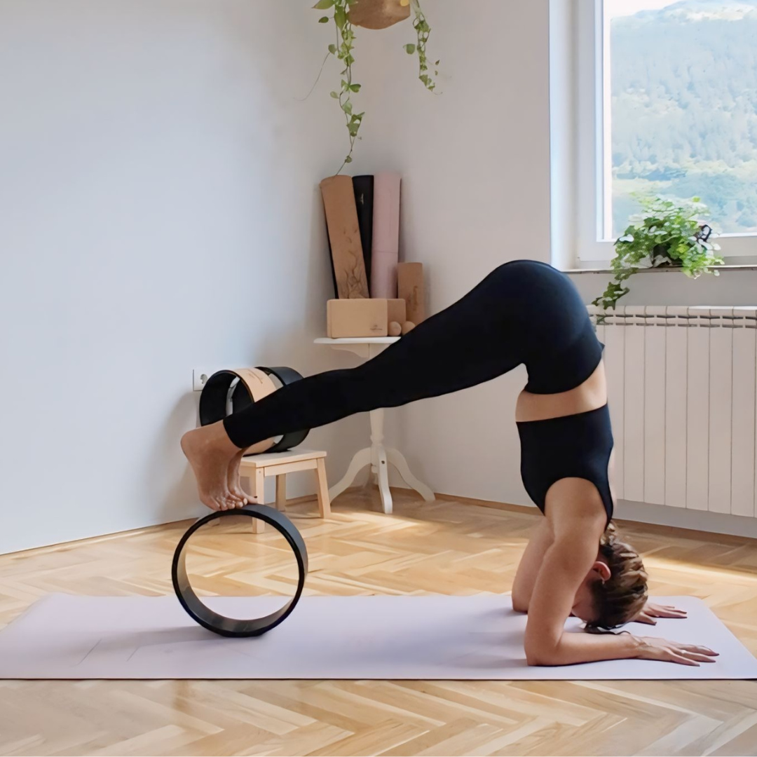- Balance Exercises: Stand on one leg and place the yoga wheel under the arm opposite your standing leg. Use the wheel for support as you challenge your balance in this position.